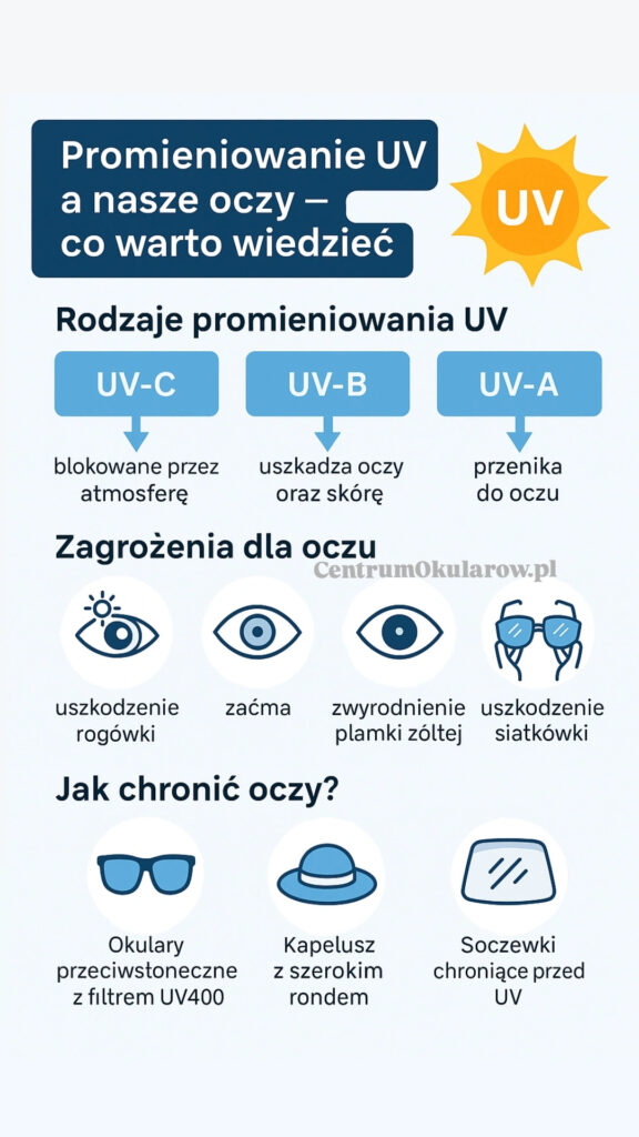 Wiele osób mylnie sądzi, że jeśli szkła są ciemne, to chronią oczy. Niestety, tanie okulary bez filtrów UV mogą wyrządzić więcej szkody niż pożytku – źrenica się rozszerza, a do oka trafia więcej szkodliwego promieniowania. Dlatego warto wybierać okulary z potwierdzonym filtrem UV400 – to on blokuje 100% szkodliwego promieniowania UVA i UVB.